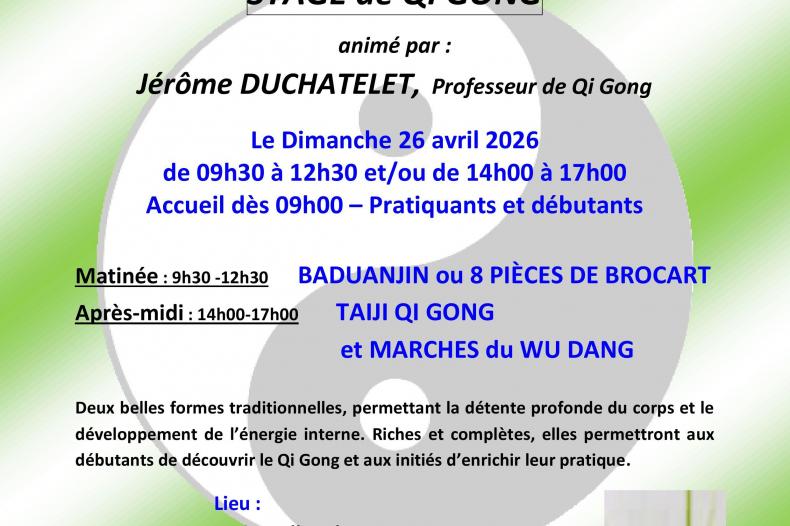 31 mar Stage Qi Gong -Dimanche 26 avril 2026 L'association a le plaisir de vous inviter au stage annuel qu'elle organise sous la direction de Jérôme Duchatelet.